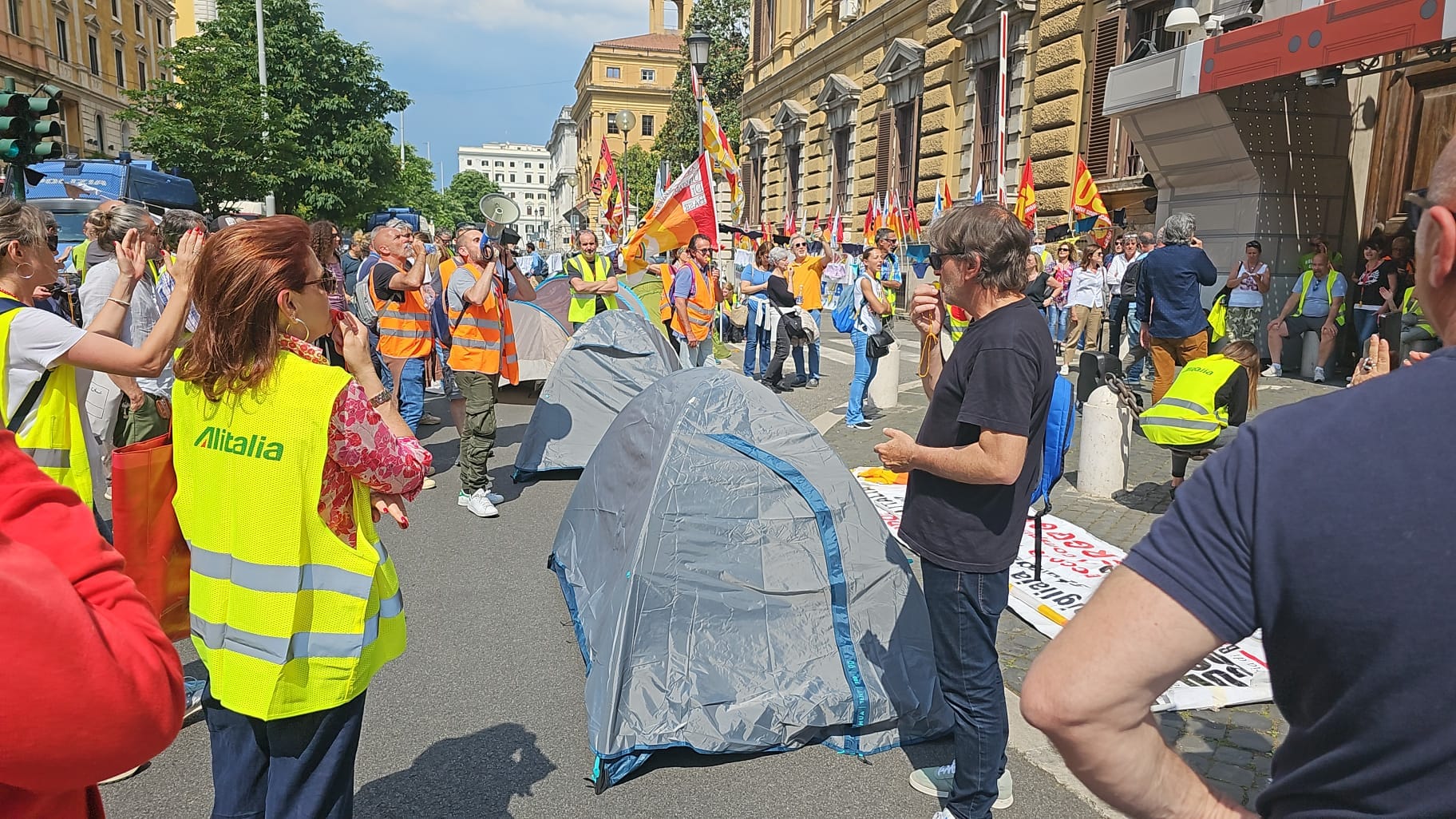 Un nutrito gruppo di lavoratori e lavoratrici ex Alitalia, rimasti eroicamente sempre in piazza, si sono subito riorganizzati attraverso un’importante assemblea, indetta il 16 maggio da Cub, Usb e il Comitato Tutti A Bordo, che ha visto la partecipazione di centinaia di persone riunite per dare un messaggio ben chiaro: è giunto il momento di alzare il livello dello scontro; l’assemblea è terminata sotto i cancelli della Regione Lazio per chiedere un incontro alla nuova giunta (3). A seguire c’è stata l’importante giornata di lotta il 25 maggio, che ha visto nuovamente per le vie di Roma centinaia di lavoratori e lavoratrici con canti, striscioni e fumogeni giunti sotto le finestre di via XX settembre (Mef) per allestire un presidio permanete con tende.
