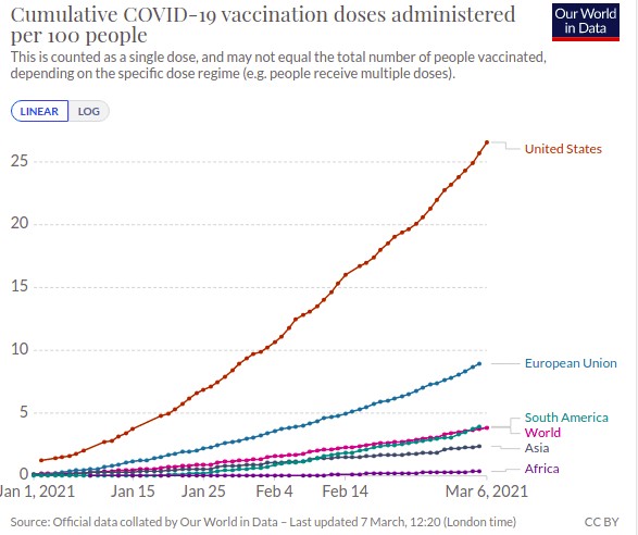 La linea quasi piatta dell'Africa sul grafico indica il percorso della tragedia ma, anche in altri continenti, alcuni Paesi che sono andati un po' più avanti nella vaccinazione finiscono per alzare la linea sul grafico senza rappresentare un quadro regionale realistico.