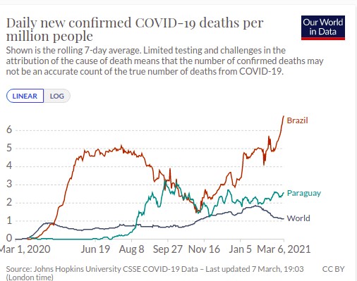 Sabato 6 marzo, in Paraguay, vi sono state grandi manifestazioni che chiedevano le dimissioni del presidente Mario Abdo Benítez, a causa della mancanza di medicinali basilari per mantenere in vita i pazienti ricoverati con il Covid, una situazione denunciata dai sindacati degli infermieri e dai parenti dei pazienti ricoverati.
